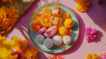 A beautiful arrangement of Indian sweets displayed on a pastel plate, surrounded by colorful flowers, perfect for celebrations and festive gatherings.