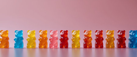AI Generated. Colorful Gummy Bears Standing in a Row on Pink Background Sweet Treat Delicious Candy