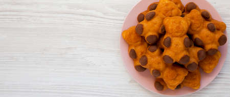 Homemade Sweet Bears Cookies on a white wooden background, top view. From above, flat lay, overhead. Copy space.