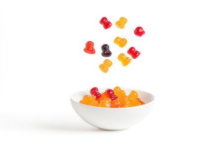 Multicolored marmalade gummy bears levitate in mid-air, isolated on white, emphasizing sweetness, fun, and candy product visuals.