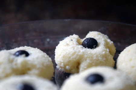 Homemade coconut cookies with blueberries on a wooden background. Selective focus.