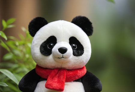 a white knit panda bear with a purple scarf is captured in this tabletop photograph. the vibrant violet background complements the dark pink and black details of the miniatures. the monochromatic color scheme creates a striking contrast, while the crossed colors of light violet and light orange add an interesting touch. the composition features ready-made objects, resulting in a visually appealing image. ai generated