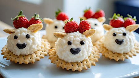 A fun and creative sheep-shaped snack made from yogurt, fruit, and crackers, perfect for a kids' lunch.
