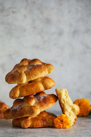 Bread of the dead and marigold flowers on grunge background. Celebration of Mexico's Day of the Dead (El Dia de Muertos)
