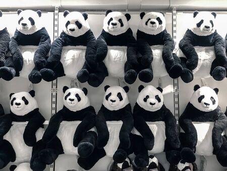 panda dolls hang on to the wall for sales in kid depart at departmentstore.