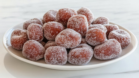 A beautiful arrangement of sugary snacks on a white plate, showcasing round, delicious treats perfect for dessert, enhancing any gathering or coffee break scene.