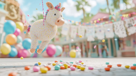 Festive colorful pinata unicorn with balloons and confetti background, AI generated