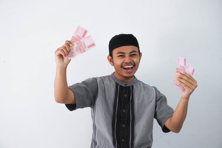 Portrait of happy young Indonesian man holding rupiah money, smiling laughing winning gesture, over white background