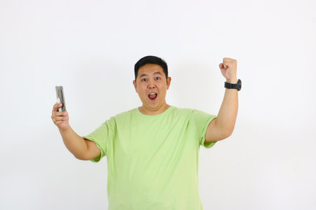 Excited Asian Man Celebrating with Smartphone making yes success gesture