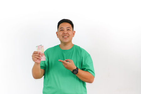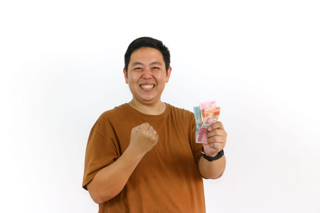 An Indonesian Asian man holds money, cheering and expressing excitement about good news or a financial win.