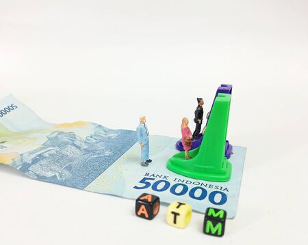 Simple Photo ilustration for Financial Transaction at Automatic Teller Machine, 50000 indonesia rupiah money as a floor, pencil sharpener as a ATM machine, with word from plastic cube bead, white background