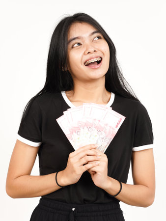 Holding 100000 Rupiah Banknote of Beautiful Asian Woman Isolated On White Background