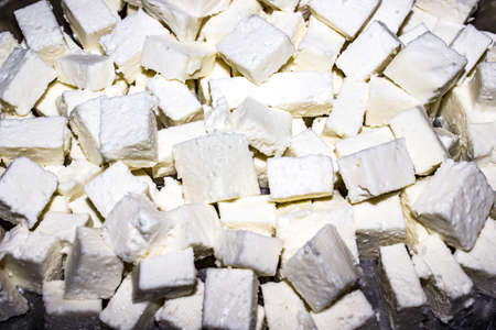 close up of fresh cheese cubes on a spoon on white background.