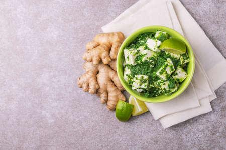 Palak Paneer made of spinach and paneer cheese on grey stone background. Indian cuisine.