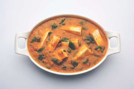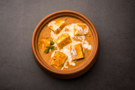 Paneer Butter Masala or Cheese Cottage Curry, popular Indian Lunch/Dinner menu  served in a ceramic bowl, selective focus