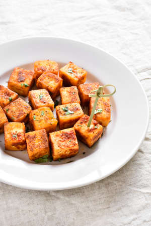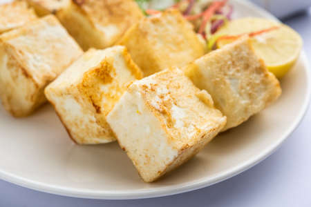 Pan fried paneer. Indian roasted cottage cheese bites on plate over light background.