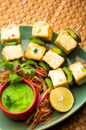 Paneer tikka is an Indian dish made from chunks of cottage cheese marinated in spices and grilled in a tandoor