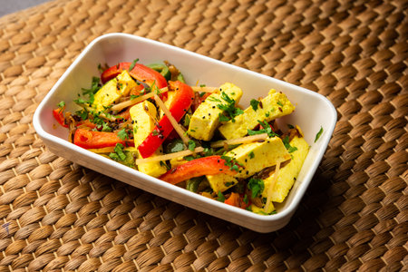 Popular Indian dish kadai paneer or cottage cheese in a bowl on a dark background.