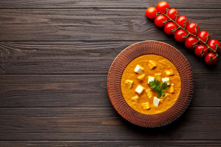 Shahi paneer traditional Indian vegetarian meal with vegetables and paneer cheese on dark wooden