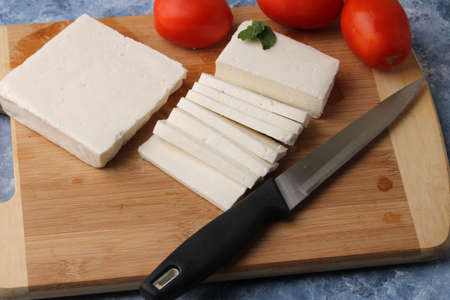 sliced fresh paneer or cottage cheese with tomatoes and knife on cutting board.