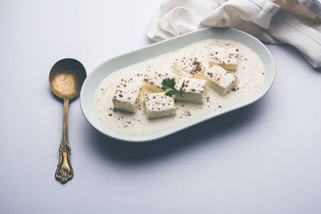 Paneer Dum Kali Mirch / Kalimirch, prepared in a white creamy gravy and black pepper powder sprinkled over it. served in a bowl. Selective focus