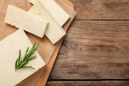 Delicious tofu with rosemary on wooden table, top view. Space for text