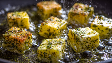 Herb-infused cheese cubes crisp up in hot oil, their golden rims contrasting sharply with a deep backdrop, evoking rich, savory kitchen warmth.