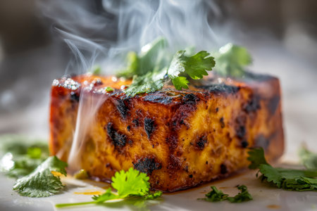 Juicy, spice-infused paneer sizzling hot, topped with vibrant cilantro sprigs, and gently steaming, set against a textured, earthy wooden background.