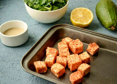 Cut tofu into cubes, roll in spices and bake at 200 degrees for 30 minutes.