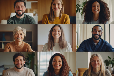A lively group of cheerful people enjoying a virtual gathering, sharing smiles in a bright and welcoming indoor space.