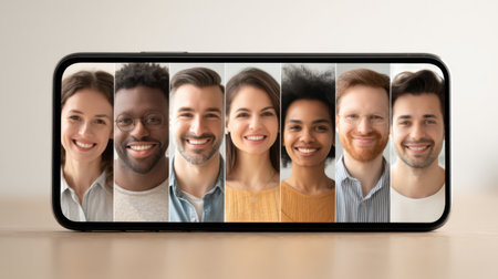 A vibrant display of smiles showcased on a smartphone, representing diversity in individuals from various backgrounds, emphasizing happiness and connection in technology.