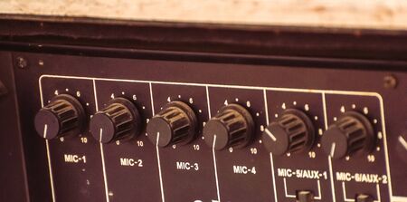 Close-up view of the knobs of an amplifier for adjusting the sound of stringed musical instruments. Concert and live performance. Music and entertainment