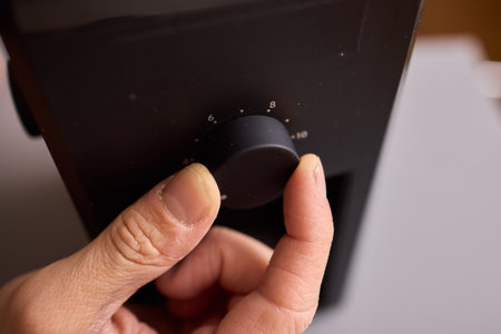 This close-up image showcases a hand gently adjusting a silver control knob on a dark background. The focus highlights the precision and craftsmanship involved in operating the device, emphasizing the intricate details of the dial and its surface.