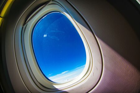 View from the porthole of the airplane window with blue sky and clouds