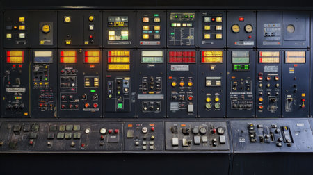 Detailed view of a control panel featuring various buttons, knobs, and gauges designed for monitoring and controlling operations in an industrial environment.