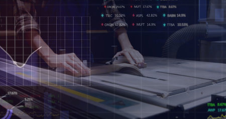 Operating circular miter saw, positioning plank on workbench, with arrows and readouts, copy space. Hardware, craftsmanship, precision, construction, workshop, woodworking, tools