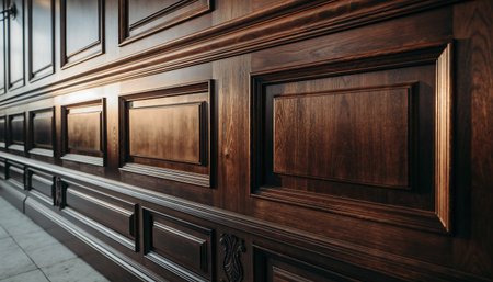 Dark brown wood wall paneling featuring elegant decorative moldings and rich grain texture, creating a classic aesthetic
