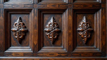 Intricate Jacobean style walnut wood paneling with geometric carvings and fleur de lis accents