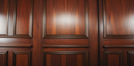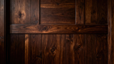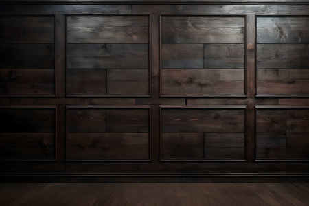 Elegant wooden wall paneling with deep brown finish and classic rectangular patterns. Perfect for luxury interior design, architectural backgrounds, renovation projects, and home decor concepts.