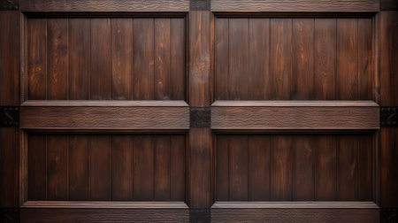 Architectural detail of rich, deeply stained wooden paneling featuring vertical boards and cross beam elements, emphasizing the natural wood grain and high contrast lighting.