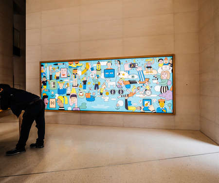 Paris, France - Circa 2019: Man admiring Apple Computers products displayed inside the new Apple Store Champs-Elysees largest French store - wall with drawn comics characters today at Apple