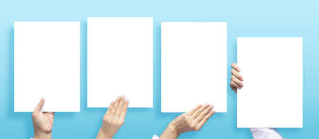 set of hands holding empty white blank letter paper size A4 for flyer or invitation mock up in different composition isolated on a blue background.