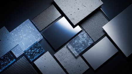 An abstract arrangement showcases various geometric squares and rectangles. The composition features diverse textures like brushed metal, patterned surfaces, and smooth finishes. The palette incorporates shades of gray, blue, and black, enhanced by subtle lighting. This imagery is suitable for backgrounds, design elements, and commercial projects.