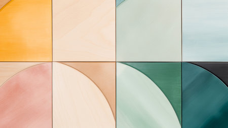 A vibrant display of square blocks in various colors is arranged on a wall, creating an artistic and visually appealing pattern. The colors range from blues to yellows, showing design creativity.