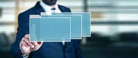 man touching files in screen in abstract background