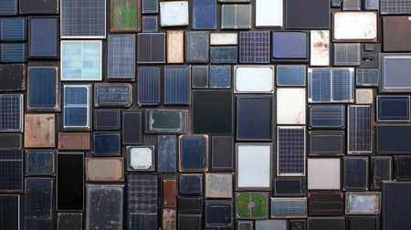 A captivating overhead view of diverse solar panels showcasing various designs and textures. This image highlights the importance of renewable energy solutions.