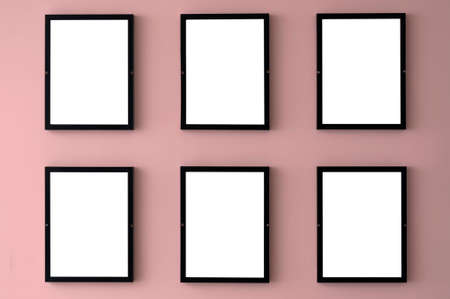 Six blank picture frames hang on a wall with the 2016 pantone color of rose quartz.