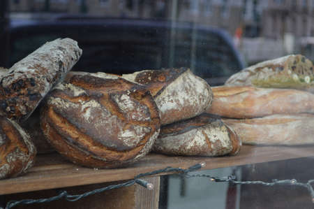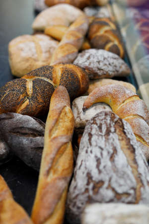 Closeup of fresh breads assortment in a bakery showroom in the morning