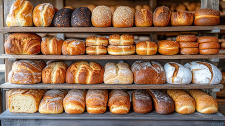 Close-up view of a bakery display. Various types of breads are neatly arranged on multiple wooden shelves. The image shows a selection of baked goods, showcasing their textures and colors. The wooden shelves create a warm and inviting atmosphere.
