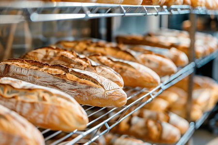 Fresh baked bread on racks in bakery. Lots of crispy buns laying on metal gratings. Generative AI